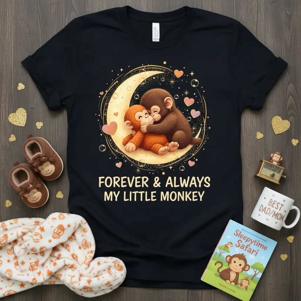 FOREVER & ALWAYS MY LITTLE MONKEY text is beautifully displayed on this comfortable black t-shirt, celebrating the unbreakable bond between loved ones. This charming design features two adorable monkeys embracing on a crescent moon, creating a heartwarming visual that resonates with parents, children, and anyone who cherishes deep connections. The surrounding stars and subtle hearts add a touch of magic and tenderness to the overall aesthetic. It’s more than just a t-shirt; it’s a wearable expression of enduring love and affection, perfect for making everyday moments feel special.