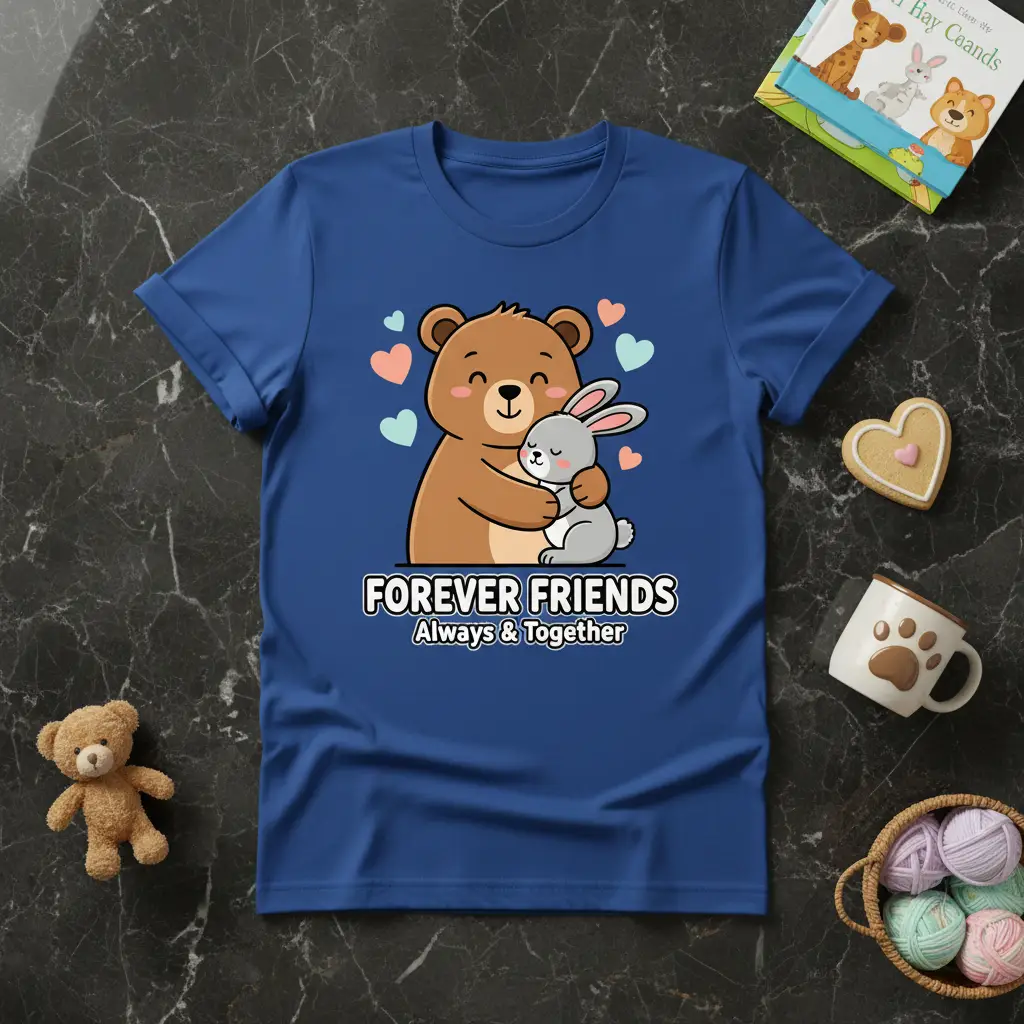 This delightful t-shirt is more than just apparel; it’s a wearable testament to the power of friendship. The design features a lovable bear in a warm embrace with a cute bunny, visually representing the security and affection found in a close bond. Surrounded by soft hearts, the imagery evokes feelings of love, care, and unwavering support that define true friendship. It’s an ideal choice for those who believe that some friends are always and together, no matter the distance or time.