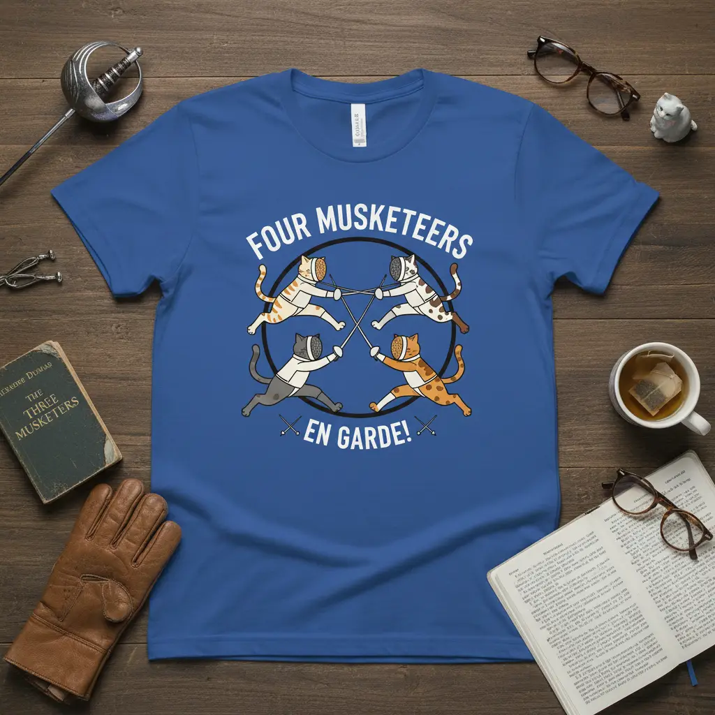 Embrace the spirit of adventure with this unique graphic tee. The design prominently features the phrase “FOUR MUSKETEERS EN GARDE!”, accompanied by four charming cats dressed in fencing attire, complete with tiny foils. This clever visual play on Alexandre Dumas’ classic novel makes it an exceptional choice for fans of literature and animal lovers alike. The bold typography and engaging artwork ensure that this shirt is not just apparel, but a statement piece.