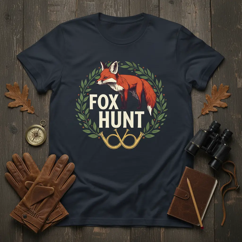 This T-Shirt proudly displays the “Fox Hunt” motif, a design deeply rooted in tradition and celebrated by many. The artwork features a majestic fox, rendered with striking detail, standing at the center of a lush green laurel wreath. This wreath signifies victory and natural beauty, framing the fox perfectly.