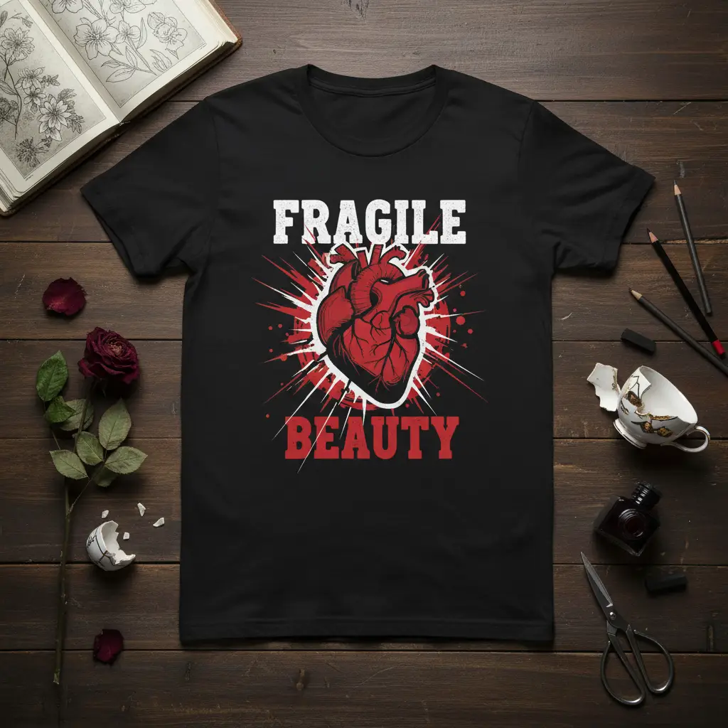 The design prominently displays the words “FRAGILE BEAUTY” in bold, impactful lettering, framing a meticulously rendered anatomical heart. The vibrant red of the heart, set against a radiant burst of white and red lines, symbolizes passion, life, and the intense emotions that define us. This artwork invites contemplation on the balance between our tender sides and our inherent resilience, making it a meaningful addition to any wardrobe.