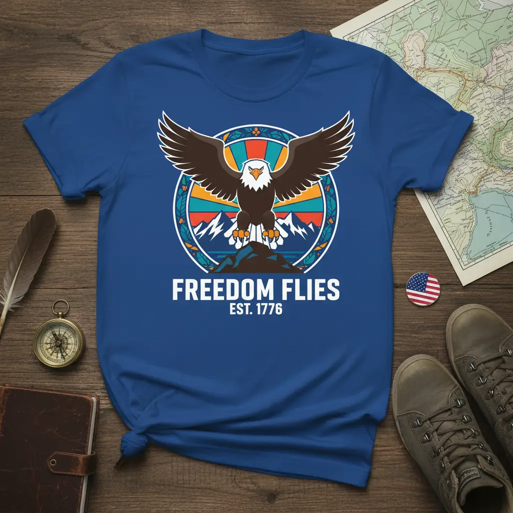 The FREEDOM FLIES EST. 1776 Eagle T-Shirt is a bold statement of American pride, featuring a majestic eagle and historical significance. This comfortable tee is perfect for anyone who cherishes freedom and heritage, making it an ideal gift for patriots and history enthusiasts alike. Wear your patriotism with pride and comfort.