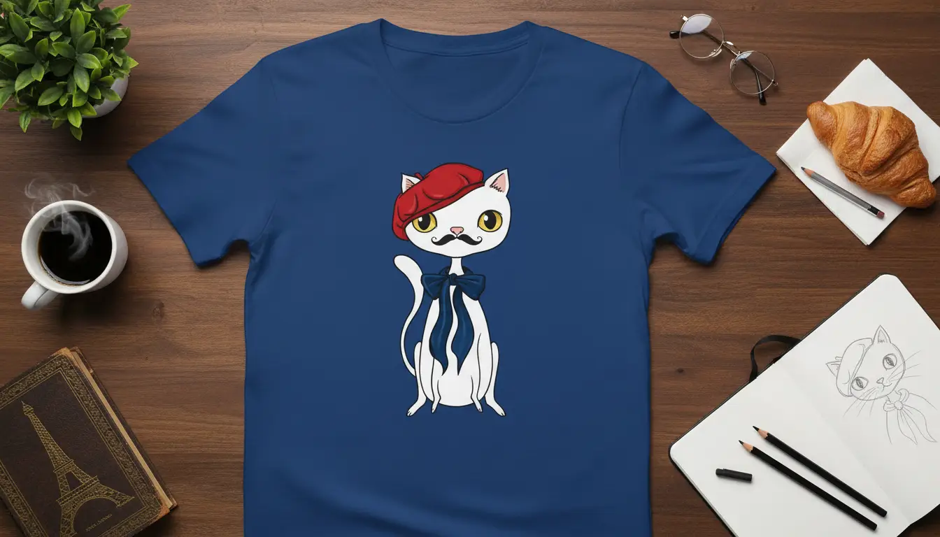 French Cat Cartoon T-Shirt: Parisian Feline Style