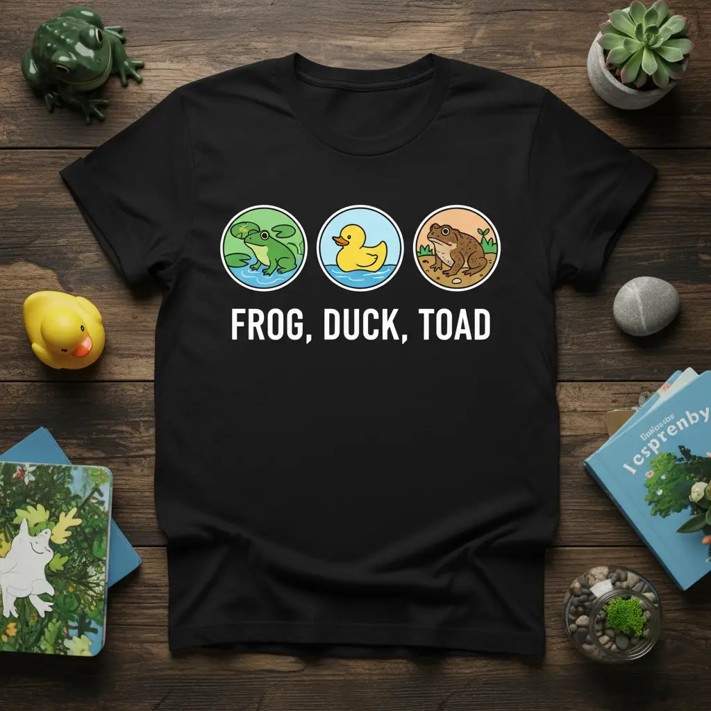 This t-shirt showcases a delightful design featuring three distinct, charming icons: a vibrant green frog perched on lily pads, a sunny yellow duck floating serenely, and a textured brown toad in its natural habitat. These illustrations are neatly contained within circular frames, adding a polished look to the overall composition. Below these engaging graphics, the text “FROG, DUCK, TOAD” is prominently displayed in clear, uppercase lettering. This combination of visual elements and text makes the design instantly recognizable and appealing to a wide audience.