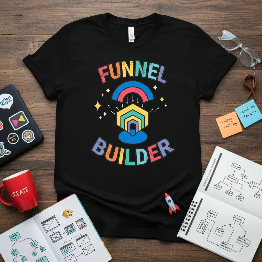FUNNEL BUILDER T-Shirt: This unique tee is designed for the strategic minds and digital architects who craft seamless customer journeys. It’s more than just apparel; it’s a badge of honor for entrepreneurs, marketers, and business owners dedicated to growth. The vibrant design captures the essence of building effective sales funnels, making it a conversation starter and a statement of your expertise. Show the world you know how to convert leads into loyal customers with this comfortable and stylish garment.