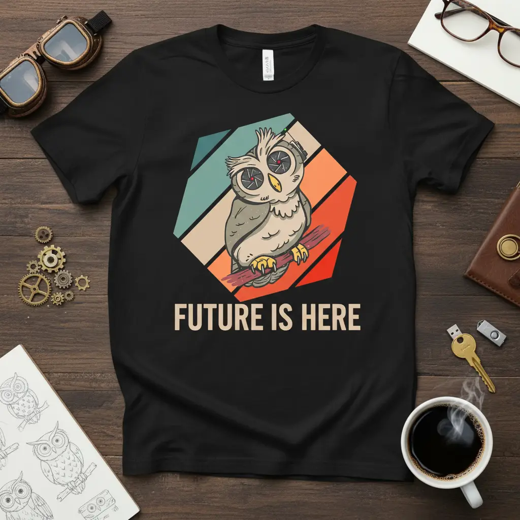 FUTURE IS HERE, and this t-shirt is your perfect companion to embrace it. This unique design features a stylized owl with camera lens eyes, perched confidently on a branch, symbolizing vision and innovation. The retro color palette, with its warm oranges, cool teals, and muted creams, evokes a sense of nostalgia while looking firmly towards what’s next. It’s more than just apparel; it’s a statement piece for the forward-thinker, the tech enthusiast, and the lover of all things owl-related. Wear your vision proudly and let the world know that the future is now.