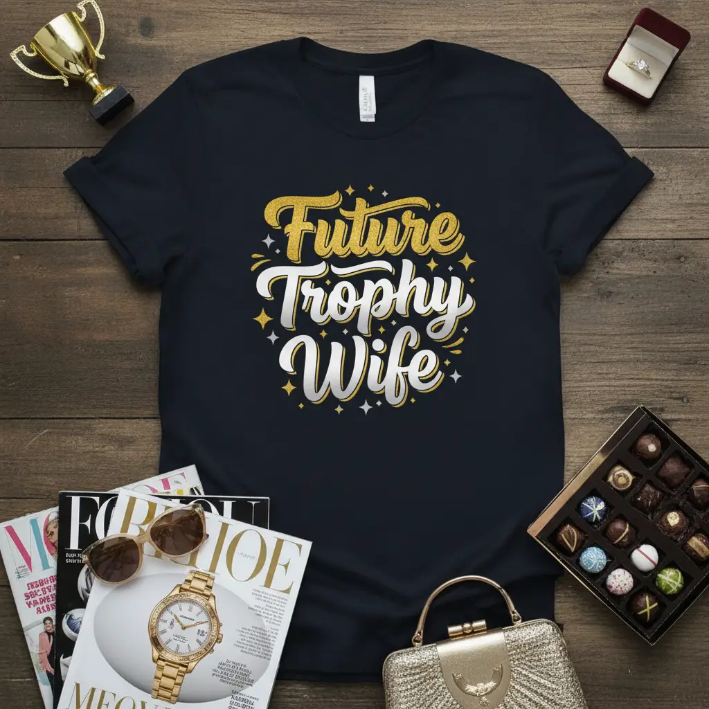 The “Future Trophy Wife” text is rendered in a beautiful, glittering script that catches the light, making it a truly special piece. Accented with sparkling stars, the design embodies the celebratory mood of a wedding season. This shirt is ideal for the bride who loves to make a statement and embrace her new role with flair and humor.