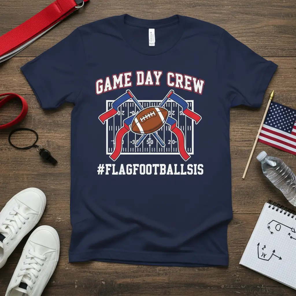 This GAME DAY CREW #FLAGFOOTBALLSIS design features a dynamic football graphic surrounded by crossed flags, evoking the energy of the game. Combined with the catchy “GAME DAY CREW” and “#FLAGFOOTBALLSIS” slogans, this tee is a must-have for any fan’s wardrobe. Its eye-catching appearance ensures you’ll stand out and connect with fellow enthusiasts.