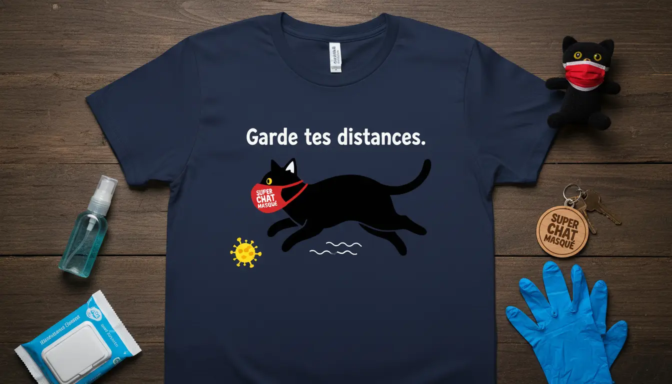 This “Garde tes distances. SUPER CHAT MASQUÉ” t-shirt is designed to stand out. The central graphic features a black cat in mid-stride, sporting a bright red mask with the words “SUPER CHAT MASQUÉ,” playfully fleeing a representation of the virus. Above this scene, the bold white text “Garde tes.”-distances.” delivers the core message in French, adding a touch of international flair. It’s a conversation starter that blends humor, awareness, and a deep affection for cats.