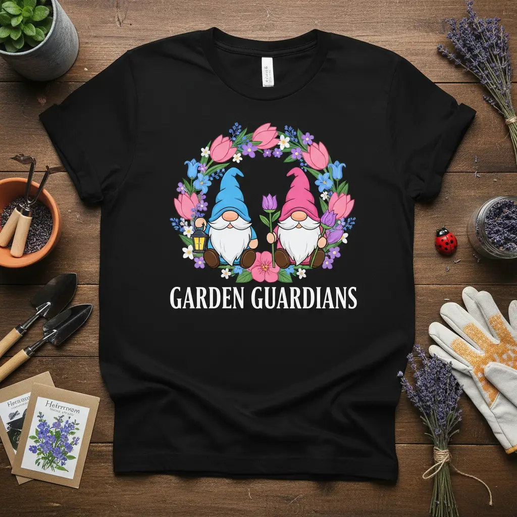 Embrace your passion for plants and bring a touch of magic to your wardrobe with the **GARDEN GUARDIANS** T-Shirt. This unique design features two adorable gnomes nestled within a vibrant floral wreath, symbolizing the protectors of every blooming space. It’s more than just apparel; it’s a statement piece for anyone who finds joy and peace among their flowers and greenery. This shirt is perfect for casual wear, gardening sessions, or as a thoughtful gift for the green-thumbed individual in your life. Let your love for gardening shine through with this charming and eye-catching design that celebrates nature’s beauty.