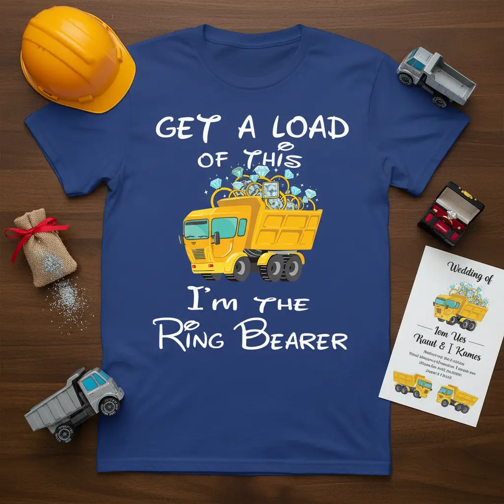 The graphic element of the dump truck symbolizes the immense value and responsibility of carrying the rings, presented in a lighthearted and memorable way. This t-shirt is crafted for comfort and durability, ensuring it can be worn throughout celebrations and beyond. It’s a testament to the memorable moments and the laughter that define a wedding.