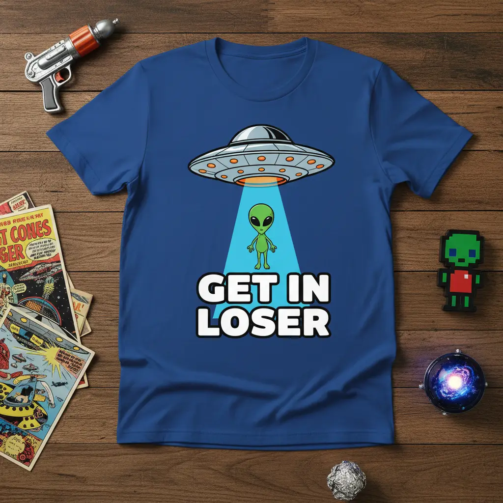 Get In Loser! This iconic phrase is emblazoned across a vibrant blue t-shirt, accompanied by a classic cartoon depicting an alien being abducted by a flying saucer. It’s a design that perfectly captures a quirky, humorous, and slightly sarcastic vibe, making it an instant favorite for those who appreciate a bit of intergalactic fun. This shirt is more than just apparel; it’s a statement piece for the sci-fi enthusiast, the pop culture aficionado, or anyone who simply enjoys a good laugh. Prepare for compliments and conversations when you step out in this out-of-this-world design.