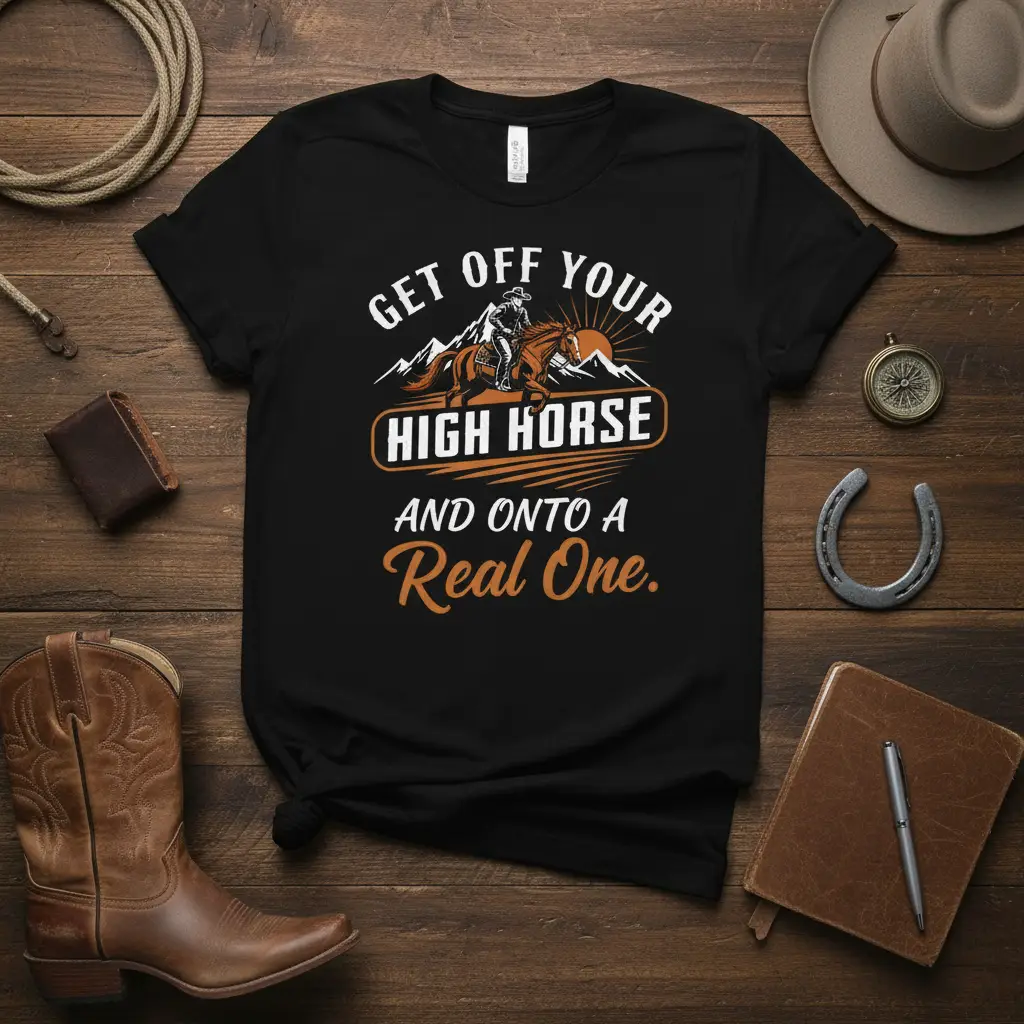 GET OFF YOUR HIGH HORSE AND ONTO A Real One. – Get Off Your High Horse And Onto A Real One. This bold statement tee is designed for the true equestrian at heart, celebrating the spirit of the open range and the bond between rider and steed. It’s more than just a shirt; it’s a declaration of passion for all things horses, embodying a lifestyle that values authenticity and a good dose of country charm. Perfect for gifting or adding a touch of western flair to your own collection.