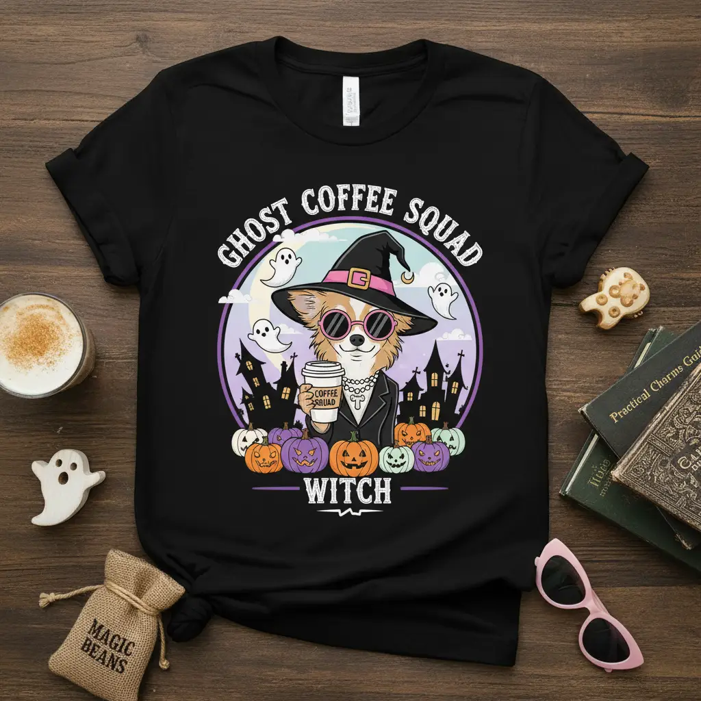This captivating t-shirt features a detailed illustration that embodies the spirit of Halloween and the love for coffee. The central character, a stylish chihuahua dressed as a witch, holds a coffee cup, embodying the “Ghost Coffee Squad.” Surrounding the character are classic Halloween elements like pumpkins, haunted houses, and playful ghosts, all set against a mystical backdrop. This Ghost Coffee Squad Witch design perfectly blends spooky aesthetics with a heartwarming, coffee-centric theme.