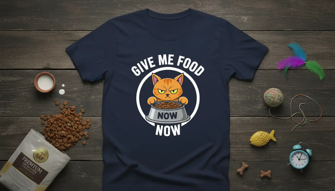 The humor in this design lies in its relatability. Cats are known for their distinct personalities and their ability to communicate their needs, especially when it comes to food. This GIVE ME FOOD NOW NOW design taps into that shared understanding, celebrating the funny, sometimes exasperating, but always endearing aspects of living with a cat. It’s a conversation starter and a statement piece that declares your love for your furry overlord.