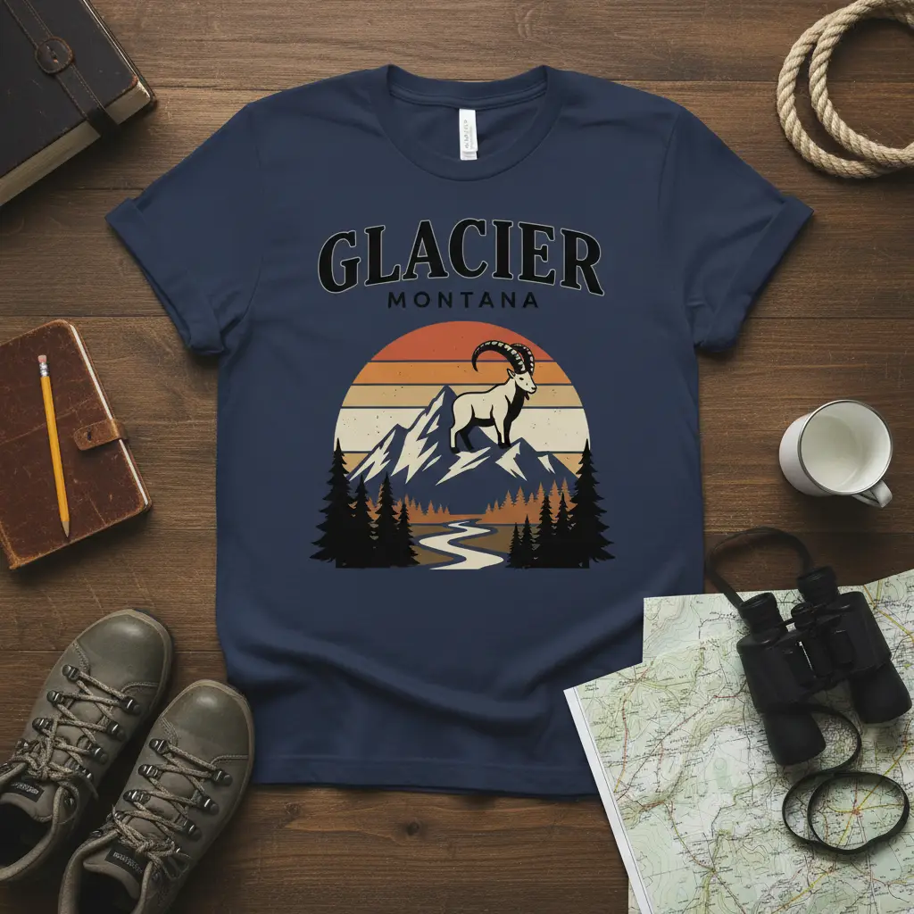 Glacier Montana is more than just a destination; it’s a feeling of awe and adventure captured perfectly on this retro-inspired t-shirt. This unique design brings the majestic beauty of Montana’s wilderness right to your wardrobe, featuring a proud mountain goat perched atop a rugged peak. The vintage sunset graphic evokes a sense of nostalgic travel and exploration, making it a cherished piece for any outdoor enthusiast or lover of classic travel apparel. It’s a wearable reminder of the breathtaking landscapes and untamed spirit of the great outdoors.