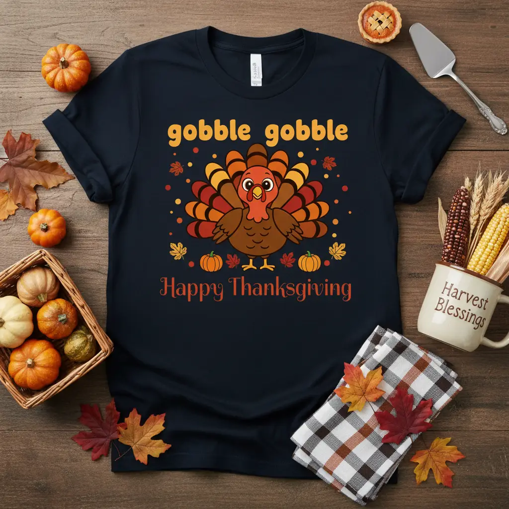 The design features a delightful cartoon turkey that embodies the playful spirit of Thanksgiving. Its friendly expression and colorful, fanned-out tail feathers are surrounded by scattered autumn leaves and cheerful pumpkins, creating a rich and inviting visual. This attention to detail ensures that the “Gobble Gobble Happy Thanksgiving” shirt is not only festive but also aesthetically pleasing, appealing to both kids and adults who love the holiday.