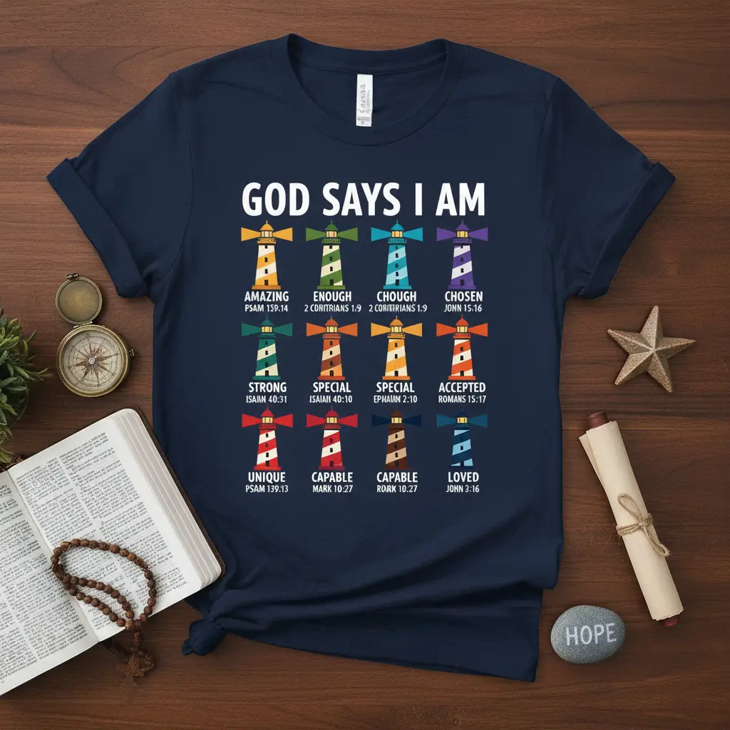 This unique t-shirt proudly displays the message “GOD SAYS I AM,” accompanied by twelve distinct lighthouses. Each lighthouse is intricately designed and colored, paired with a powerful affirmation and its corresponding Bible verse. From “AMAZING” (Psalm 159:14) to “LOVED” (John 3:16), these declarations serve as a constant source of encouragement. The visual of lighthouses guiding ships through darkness beautifully encapsulates the role of faith in navigating life’s challenges.