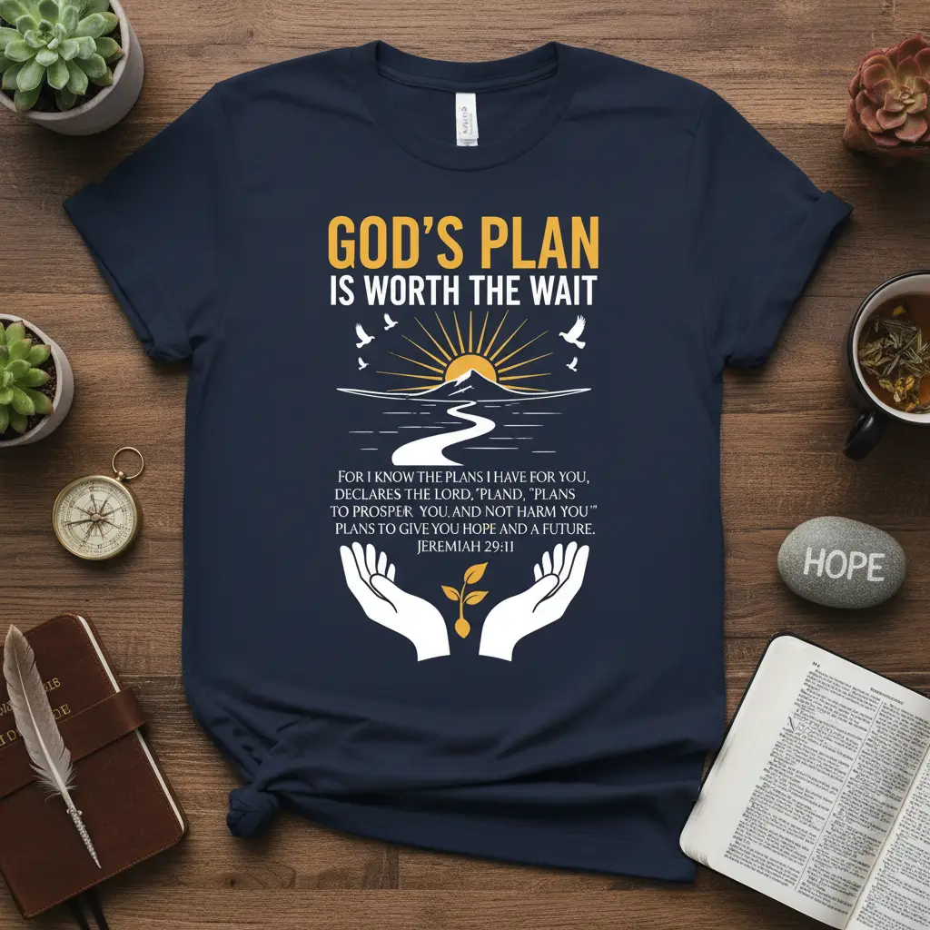 This t-shirt features the full text of Jeremiah 29:11, a powerful verse that offers profound comfort and guidance. The phrase “God’s Plan Is Worth The Wait” resonates deeply, encouraging patience and faith during challenging times. It speaks to the belief that even when the path is unclear, God’s intentions are always for our good and future. This design is perfect for anyone seeking spiritual encouragement or wishing to share their faith with the world.