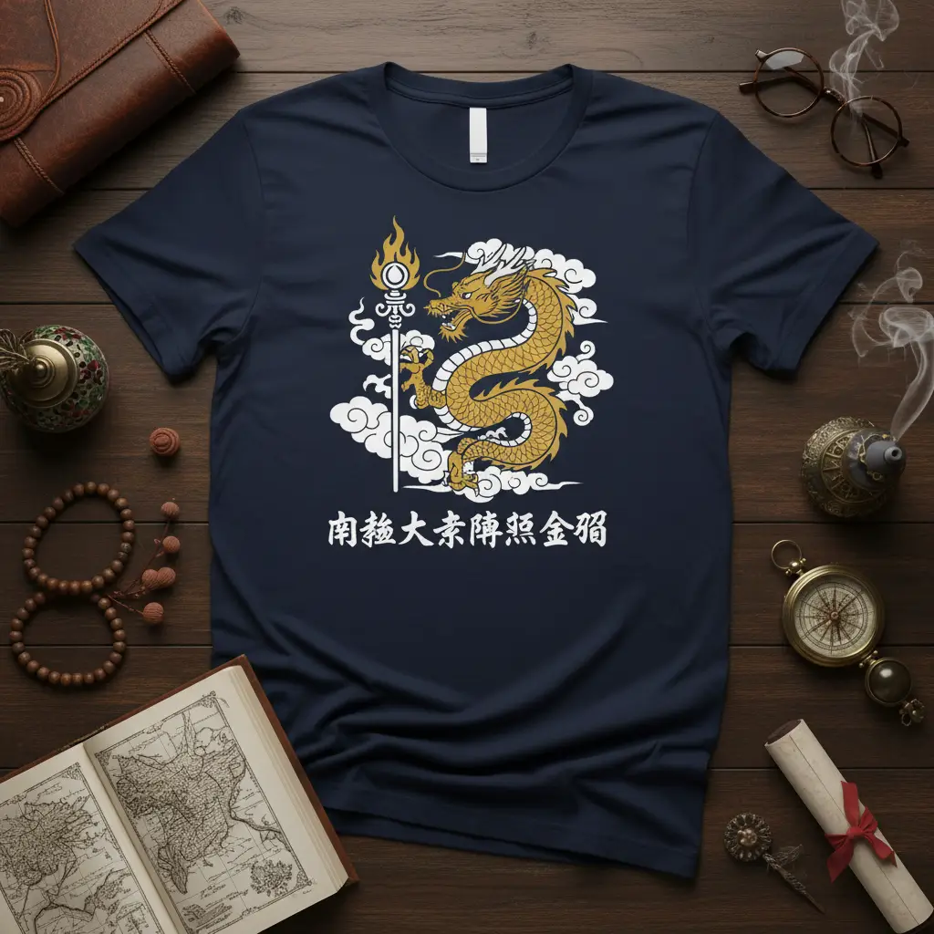 This captivating t-shirt features the striking “南極大素縛燕金羽” design, showcasing a magnificent golden dragon in all its glory. The dragon’s form is rendered with exceptional detail, from its fierce expression and flowing mane to its powerful, scaled body. It is depicted holding a staff that symbolizes authority and spiritual power, further enhancing the design’s rich narrative. The surrounding clouds add a sense of dynamism and ethereal beauty, making the dragon appear to soar through the heavens.