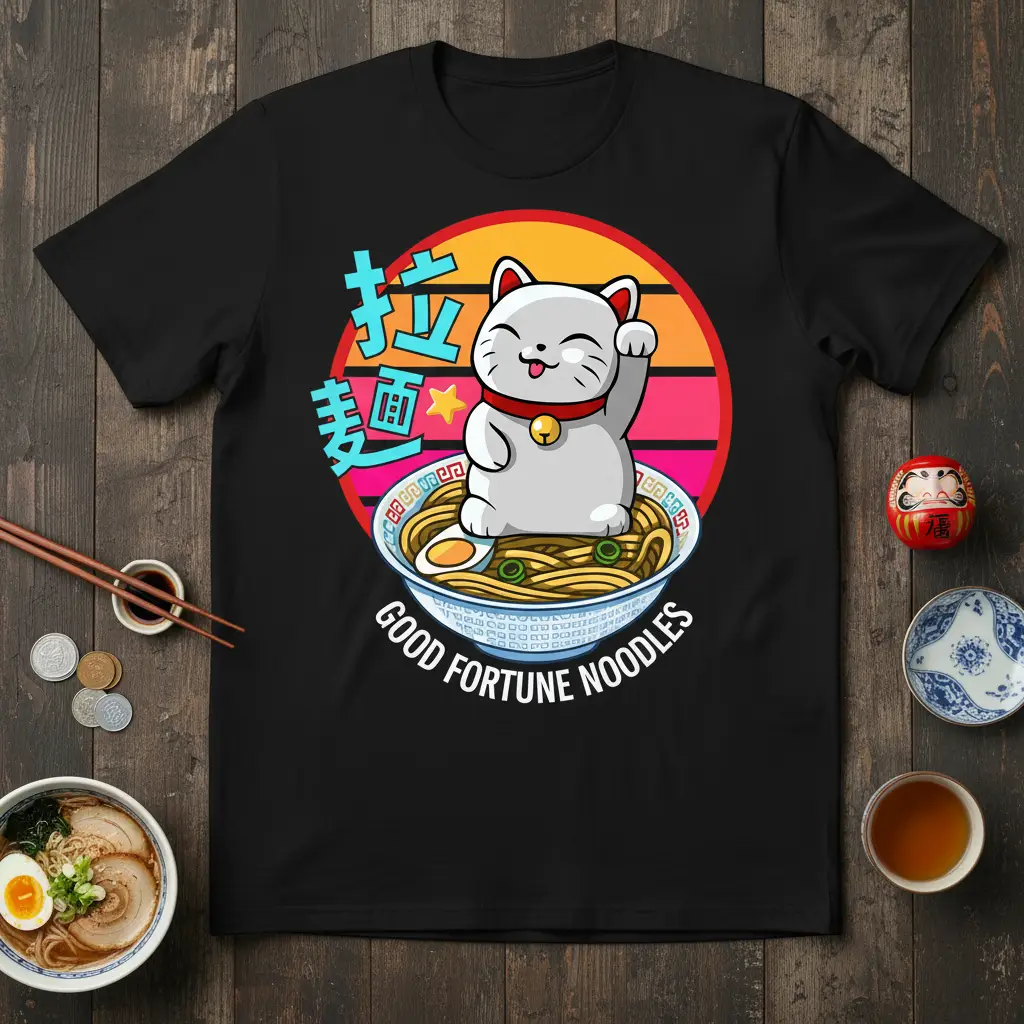 This t-shirt is designed for anyone who appreciates the finer things in life, like a delicious bowl of ramen and the comforting presence of a lucky cat. Whether you’re a seasoned foodie, a devoted cat parent, or simply someone who enjoys unique and fun graphic tees, this design is sure to become a favorite. It’s a conversation starter that celebrates your passions.