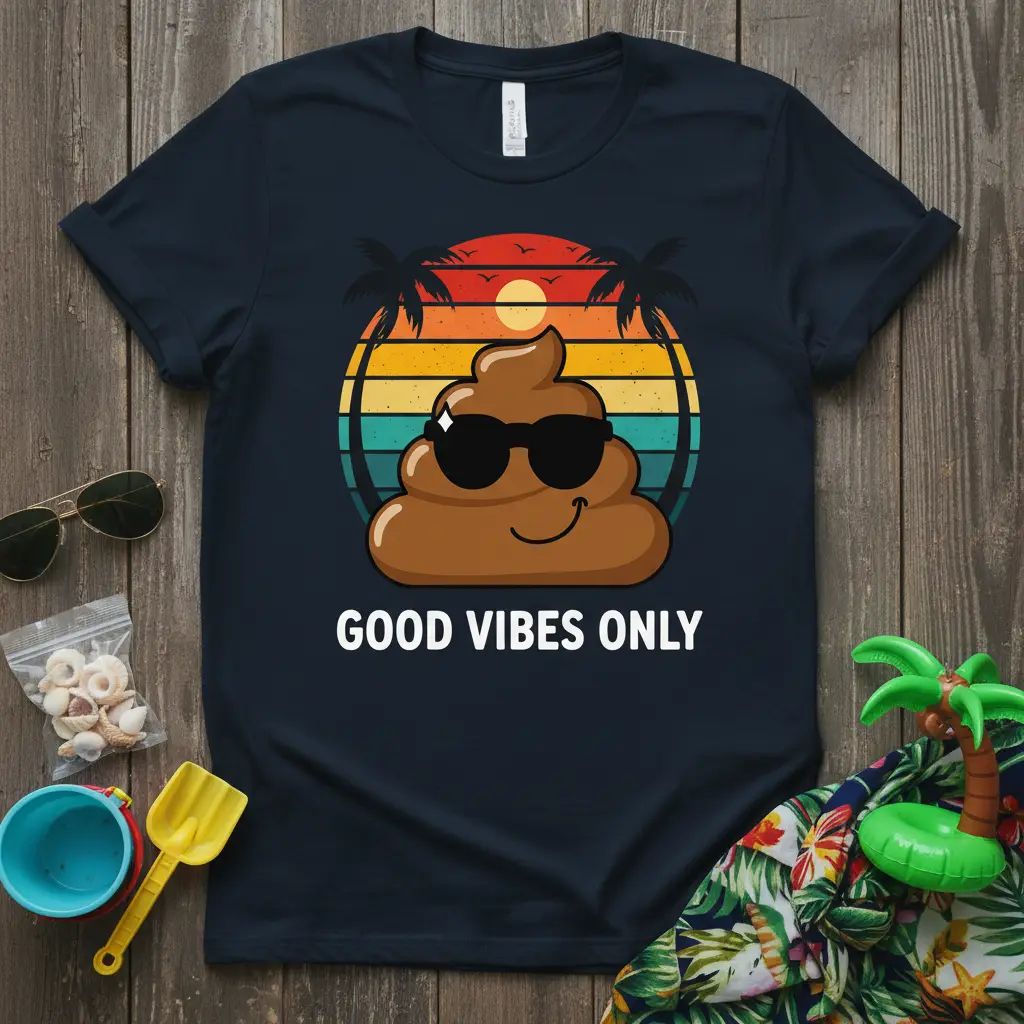 This unique tee features a hilarious poop emoji sporting cool sunglasses, set against a vibrant retro sunset with silhouetted palm trees. The playful design is perfectly complemented by the bold text “GOOD VIBES ONLY,” making it an instant favorite for those who appreciate a good laugh and a positive outlook. It’s the ideal way to express your personality and bring a touch of fun to any outfit.