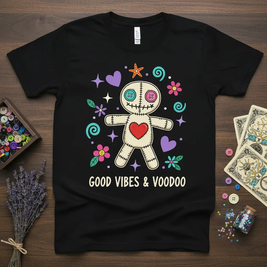 This black t-shirt proudly displays the phrase “GOOD VIBES & VOODOO” in a clean, easy-to-read font. The central graphic is an adorable, cartoon-style voodoo doll. It has stitched seams, button eyes, and a bright red heart emblazoned on its chest. The doll is playfully adorned with swirling lines, stars, and floral elements in vibrant shades of purple, pink, teal, and orange, making the overall design cheerful and inviting. It cleverly subverts traditional voodoo aesthetics into something fun and positive.