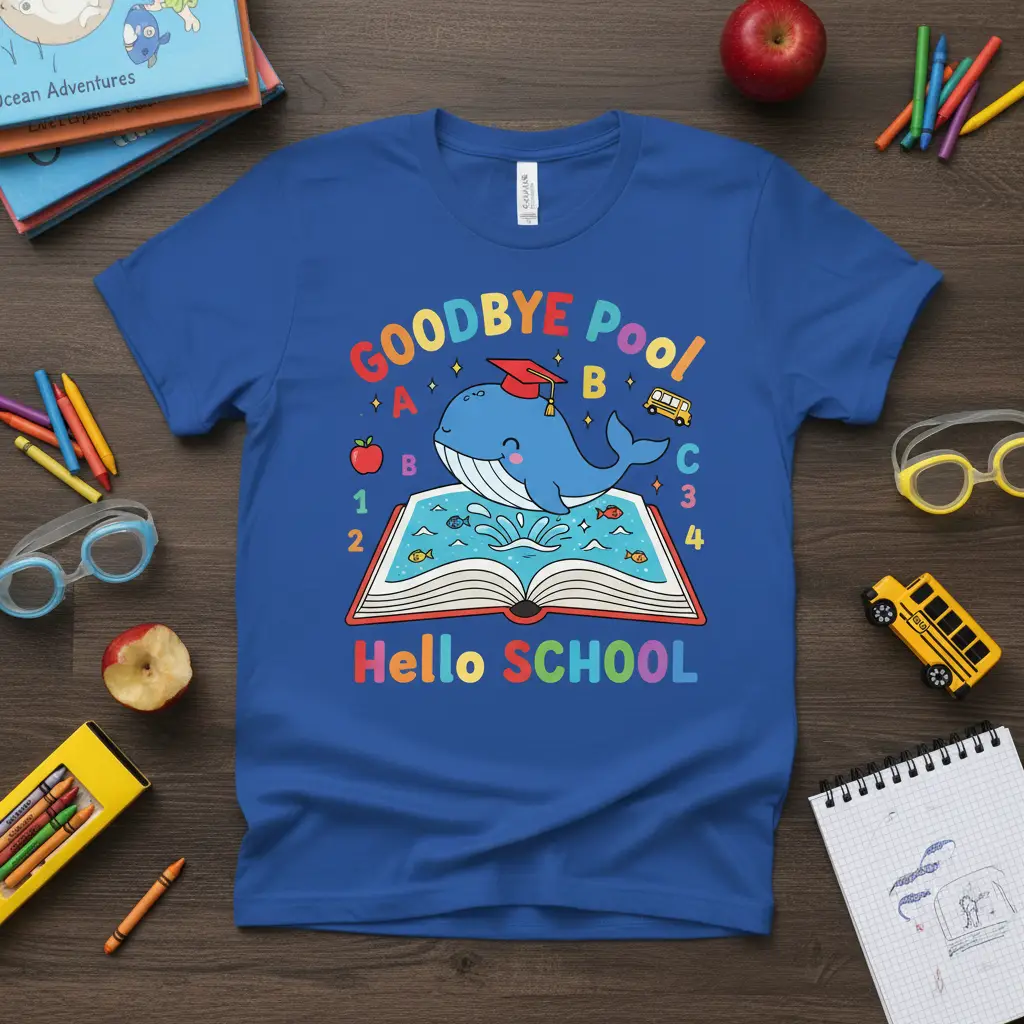 This unique “Goodbye Pool Hello SCHOOL” t-shirt features a delightful illustration of a happy whale leaping from an open book. The whale wears a graduation cap, symbolizing achievement and the journey of learning. Surrounding the whale are elements like ABCs, numbers, and fish, all reinforcing the educational theme in a whimsical way. It’s a fantastic way for kids to express their excitement for returning to the classroom.