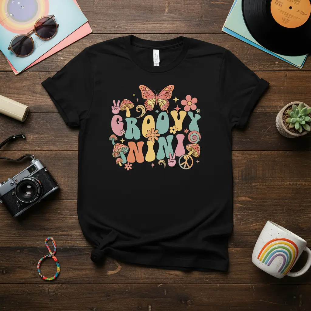 This eye-catching Groovy Nini t-shirt is designed to celebrate the amazing grandmothers in our lives. Its bold, retro typography is complemented by a playful arrangement of 70s-inspired elements, creating a look that is both fun and fashionable. The combination of warm colors and whimsical graphics makes this tee a standout piece, perfect for casual outings or special family gatherings.