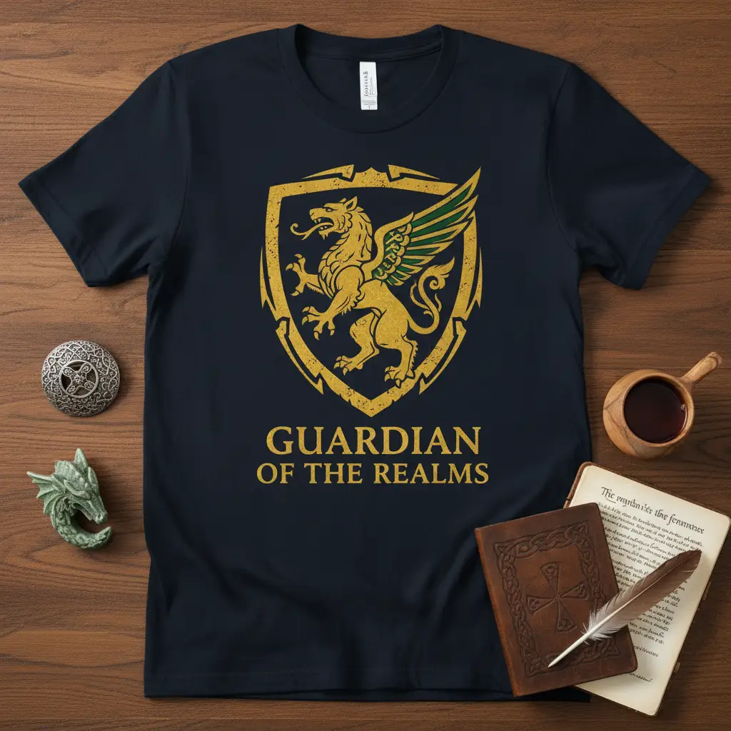 Guardian Of The Realms design is for the bold and the brave, for those who believe in legends and protect what they hold dear. This striking t-shirt features a powerful griffin crest, a symbol of vigilance and might, set against a classic background. It’s more than just apparel; it’s a statement piece for anyone who cherishes epic fantasy, mythology, and the allure of ancient realms. Wear it and feel the spirit of guardianship envelop you.