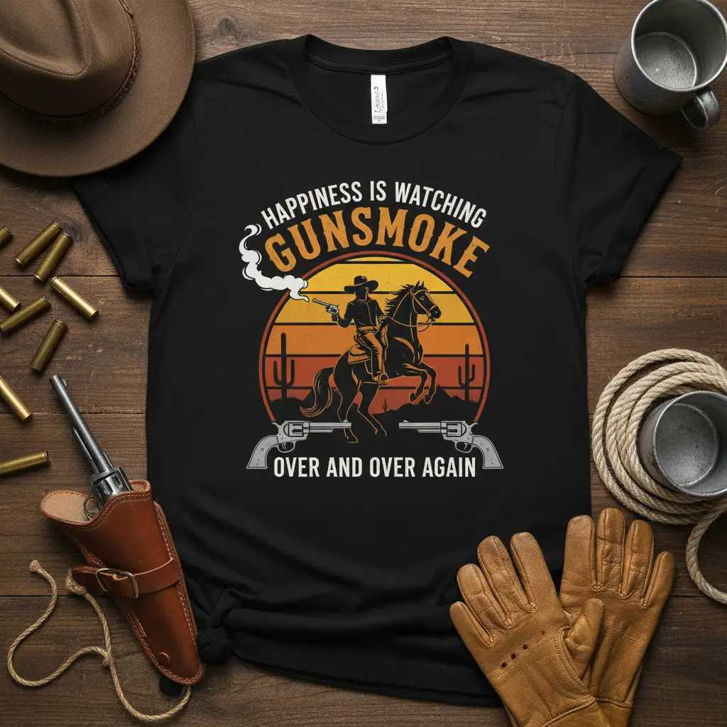 Pick from Black, Navy, Royal, Dark Heather, Red, and White to match your mood and wardrobe staples. Each colorway keeps the HAPPINESS IS WATCHING GUNSMOKE design clear and photo-ready for everyday wear.