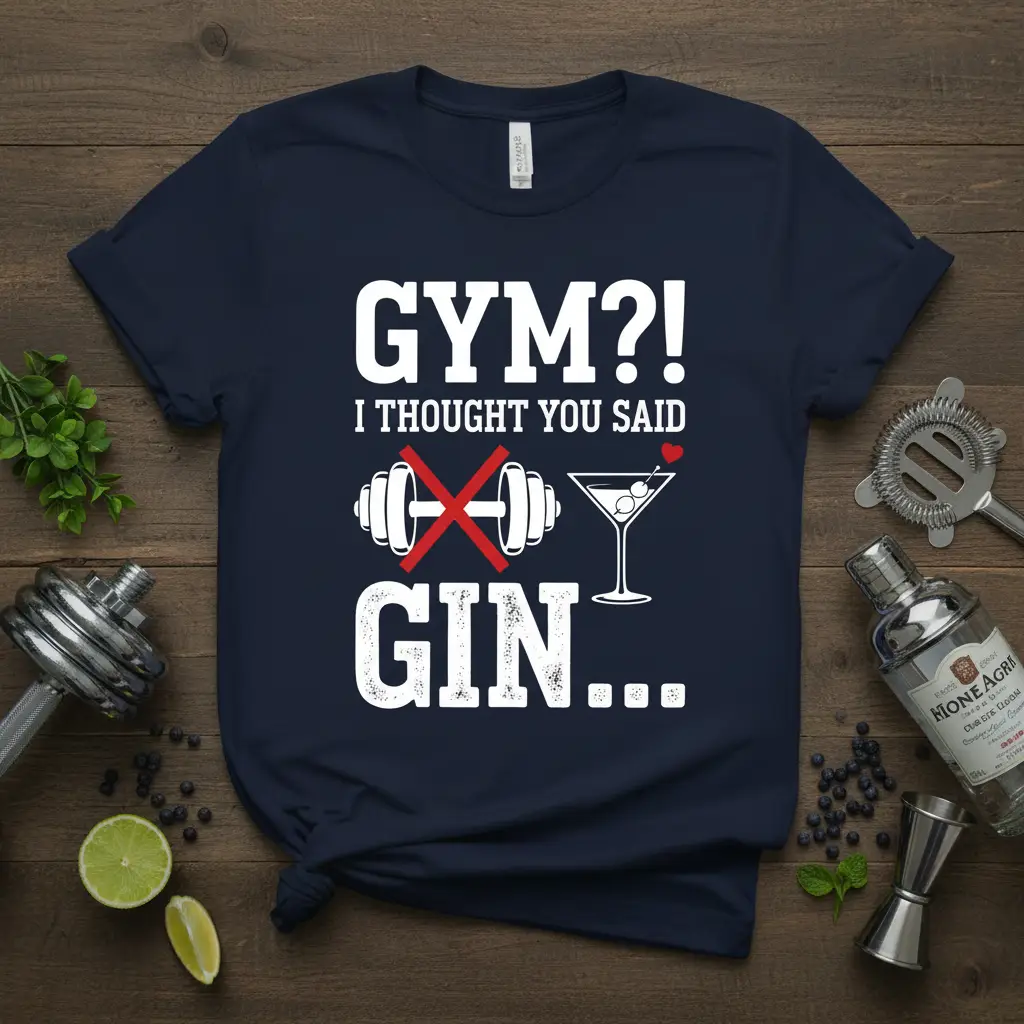 This eye-catching graphic tee features a bold design that humorously contrasts gym culture with cocktail enjoyment. The phrase “GYM?! I THOUGHT YOU SAID GIN…” is presented in a clear, impactful font, making the message unmistakable. The accompanying graphics, including crossed-out dumbbells and a classic martini glass, perfectly capture the intended wit and spirit of the design.