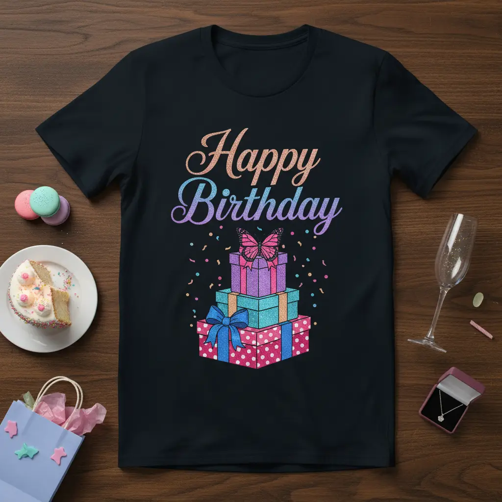 Happy Birthday to you and everyone you know! Make your next celebration truly sparkle with this festive and eye-catching t-shirt. Designed to spread joy and cheer, this tee is more than just apparel; it’s a statement of celebration. The vibrant glitter accents and playful graphics ensure you’ll stand out at any birthday party or gathering. It’s the perfect way to express your excitement for the special day and create lasting memories.