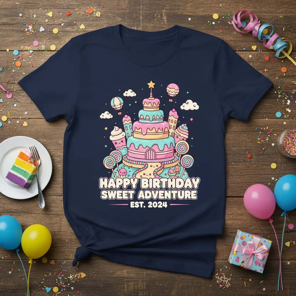 HAPPY BIRTHDAY SWEET ADVENTURE EST. 2024 is more than just a phrase; it’s an invitation to celebrate life’s sweetest moments in style. This enchanting t-shirt captures the pure joy and excitement of a birthday, transforming it into a wearable piece of art. The design features a fantastical, multi-layered cake that looks like a whimsical castle, surrounded by an array of delightful treats and airborne adventures. It’s crafted for those who believe that every birthday is an opportunity for a magical journey and a chance to create unforgettable memories.