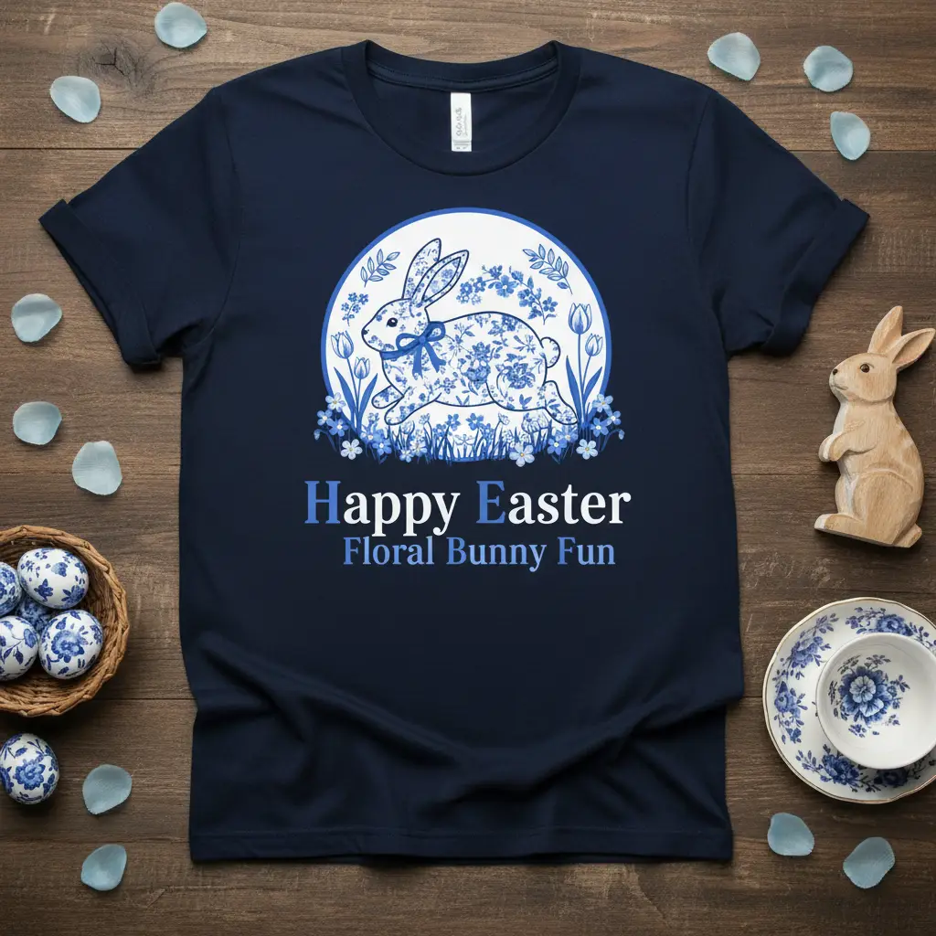 The “Floral Bunny Fun” element of the design adds a unique dimension, moving beyond traditional Easter imagery to incorporate beautiful botanical elements. This makes the shirt appealing not only for the holiday itself but also for anyone who appreciates floral motifs and nature-inspired art. The blue and white color palette offers a clean, refreshing look that complements the springtime theme perfectly, ensuring a stylish appearance for any occasion.
