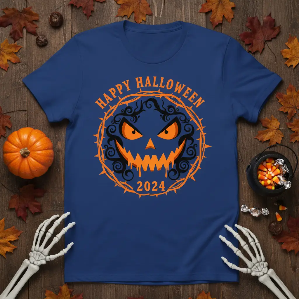 Get ready to embrace the most thrilling time of the year with our exclusive HAPPY HALLOWEEN 2024 t-shirt. This festive garment is designed to capture the eerie spirit of the season, featuring a captivating and spooky jack-o’-lantern face. The intricate thorny vine border adds a touch of dark allure, making this tee a standout piece for any Halloween celebration. It’s the perfect way to express your enthusiasm for all things spooky and fun, ensuring you’re dressed for the occasion whether you’re trick-or-treating or attending a Halloween party.