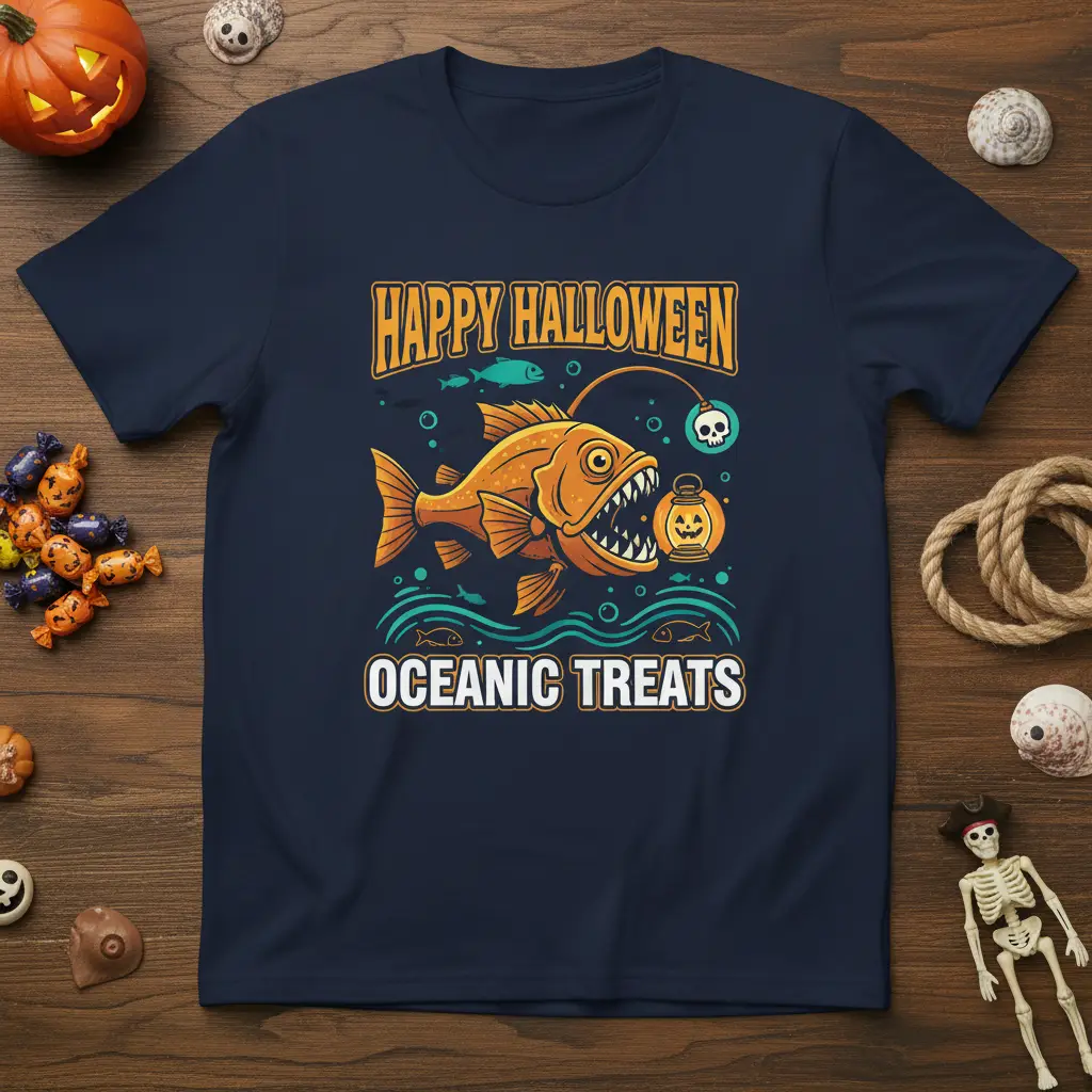 The “Oceanic Treats” theme adds a unique dimension, suggesting a playful interpretation of Halloween traditions in an underwater setting. Imagine this anglerfish luring in not just prey, but also the spirit of Halloween, offering a fresh perspective on spooky celebrations. This shirt is an excellent way to express your dual passion for the sea and the season’s festivities.