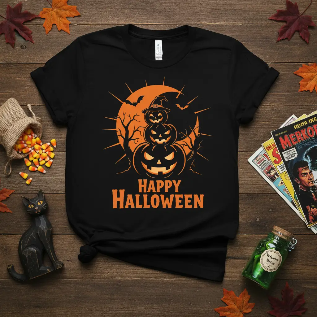 This Happy Halloween t-shirt is the ultimate way to celebrate the spookiest time of year. The design features an iconic stack of three jack-o’-lanterns, each with a unique carved face, topped with a classic witch’s hat. This whimsical arrangement is set against a backdrop of silhouetted spooky trees and flying bats, all radiating from a large, textured orange circle that evokes a full moon or setting sun.