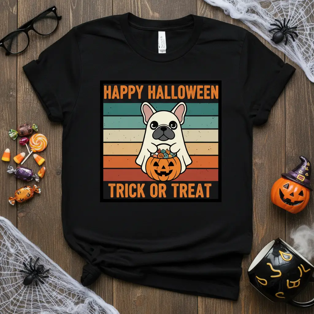 Happy Halloween Trick Or Treat in a festive design perfect for any dog lover. This charming t-shirt captures the spirit of the spooky season with an adorable French Bulldog dressed as a ghost, ready to go trick-or-treating. The vintage-inspired striped background adds a retro flair, making it a unique and eye-catching piece for Halloween parties, pumpkin patches, or just casual wear during October. It’s an ideal gift for friends, family, or anyone who adores French Bulldogs and loves celebrating Halloween with a touch of canine cuteness.