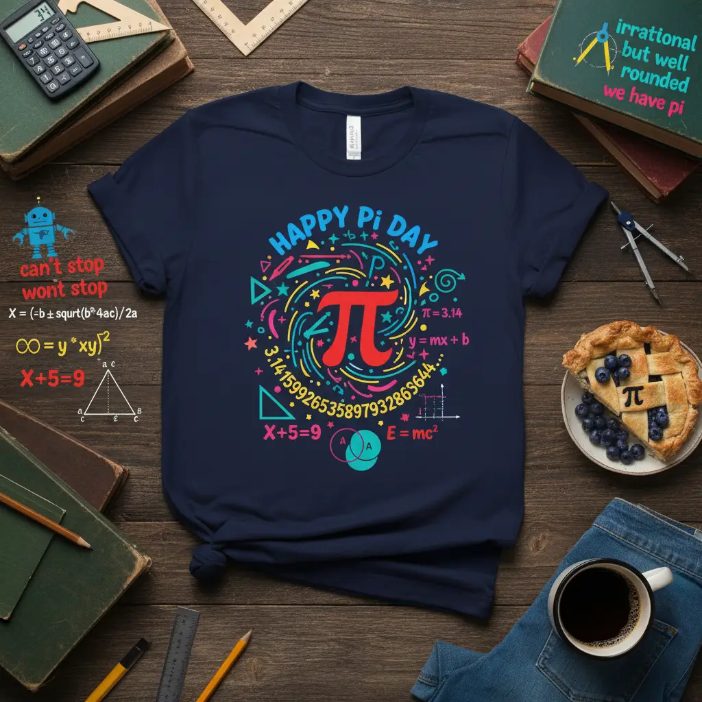 Happy Pi Day is more than just a date; it’s a celebration of mathematics, logic, and the fascinating constant that underpins so much of our world. This vibrant t-shirt captures the excitement and fun associated with this special occasion, making it the perfect attire for students, teachers, mathematicians, and anyone who appreciates the beauty of numbers. The design is a playful explosion of colors, featuring the iconic Pi symbol along with a variety of mathematical formulas and equations that will resonate with anyone who has ever delved into the world of calculus or geometry. It’s a wearable testament to the joy of learning and the enduring appeal of mathematical concepts.