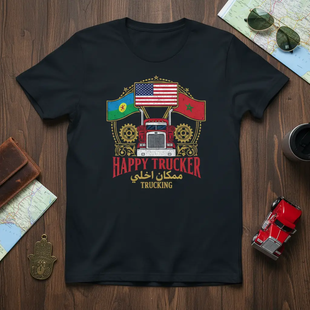 Happy Trucker Moroccan American Trucking T-Shirt is designed for the dedicated professional who navigates the highways with pride. This unique tee celebrates the blend of cultures and the relentless spirit of those behind the wheel. It’s more than just apparel; it’s a statement of identity for truckers who connect the world, one mile at a time. This design pays homage to the journey and the dual heritage that shapes many in the trucking community.