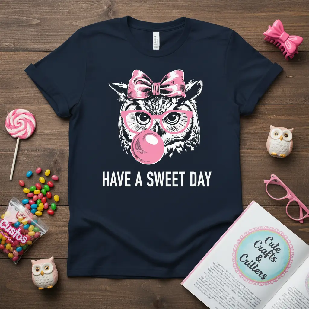 Have A Sweet Day with this incredibly charming and whimsical t-shirt design that’s perfect for adding a touch of fun and positivity to your everyday wear. This unique graphic features a delightful owl sporting stylish pink glasses and a cute pink bow, all while blowing a large, vibrant pink bubble gum bubble. It’s a design that’s sure to bring smiles and spread cheer wherever you go, embodying a spirit of lightheartedness and fun. This tee is more than just clothing; it’s a wearable reminder to embrace the sweet moments in life.