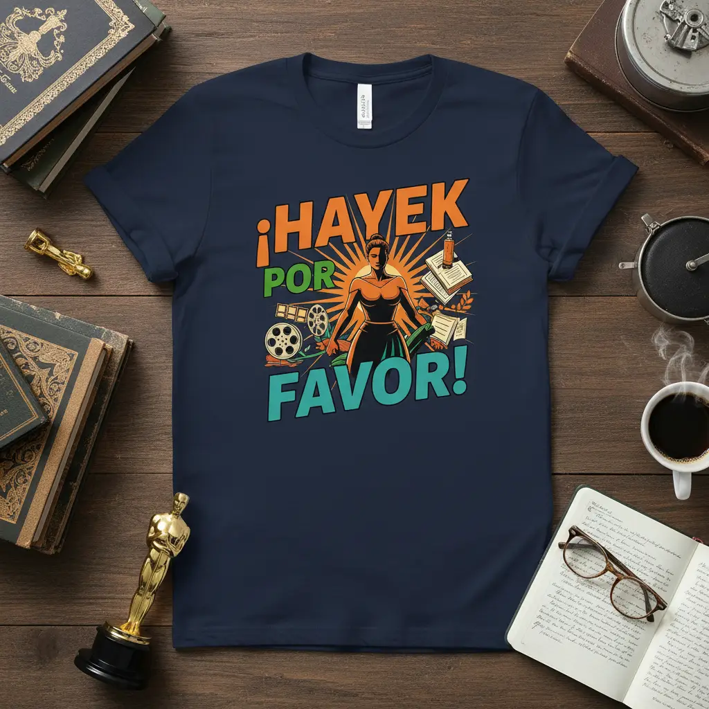 Each element of the ¡Hayek Por Favor! design has been thoughtfully chosen to convey a powerful message. The central figure embodies resilience and leadership, inspiring wearers to embrace their own strength. The inclusion of books signifies the pursuit of knowledge and the power of education as a tool for change, while the film reels highlight the influence of cinema and narrative in shaping perspectives. This intricate layering of symbolism transforms the t-shirt into a wearable piece of art that advocates for intellectual curiosity and artistic engagement.