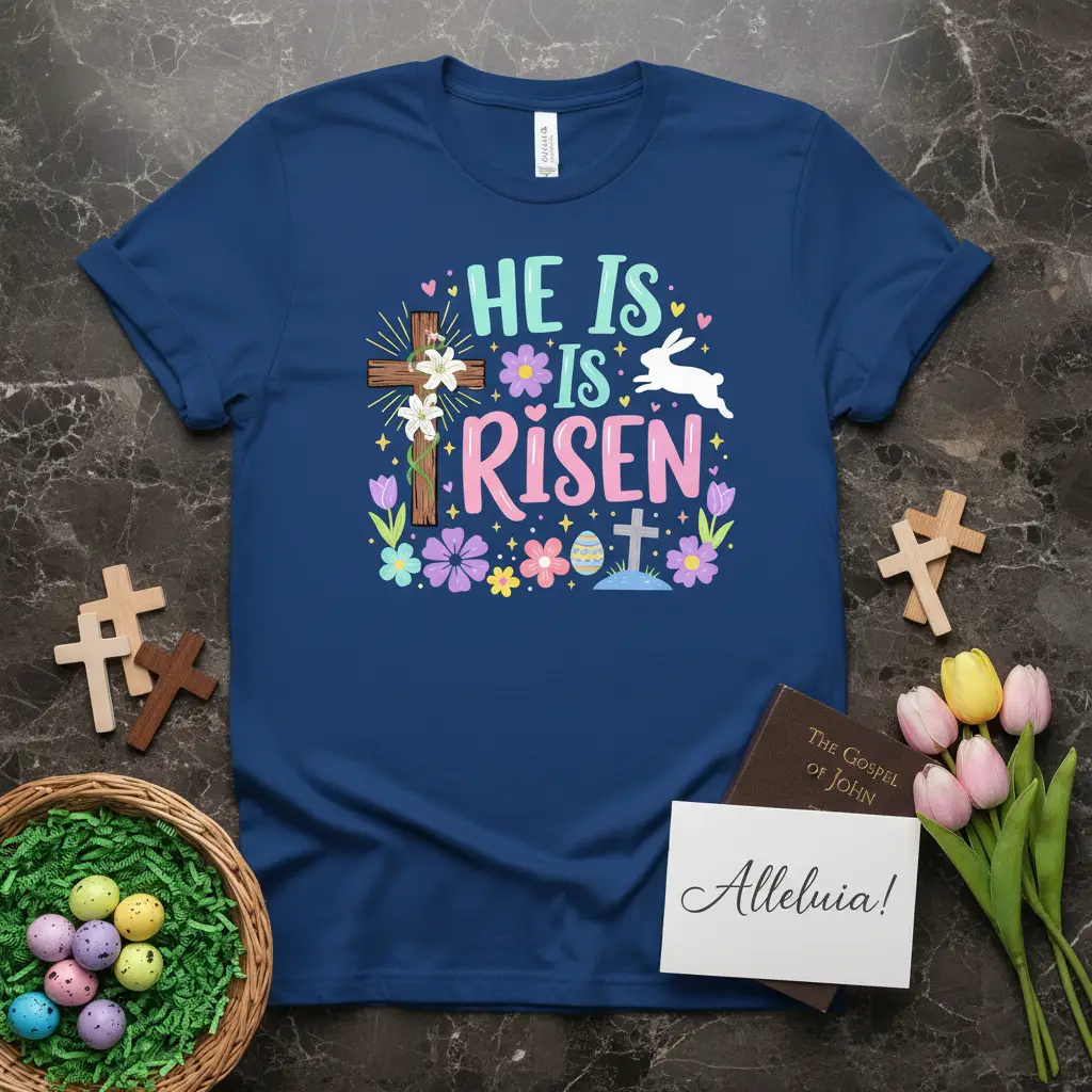 Pick from Black, Navy, Royal, Dark Heather, Red, and White to match your mood and wardrobe staples. Each colorway keeps the HE IS IS RISEN design clear and photo-ready for everyday wear.