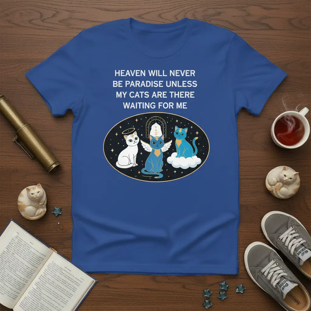 This exclusive t-shirt design is crafted for those who believe their cats are an indispensable part of their afterlife. The comforting quote resonates deeply with anyone who has experienced the unconditional love and joy that cats bring. It’s a reminder that our feline friends are not just pets, but soulmates who make every moment feel like a slice of heaven. Wear your heart on your sleeve, or rather, on your chest, with this meaningful and stylish tee.