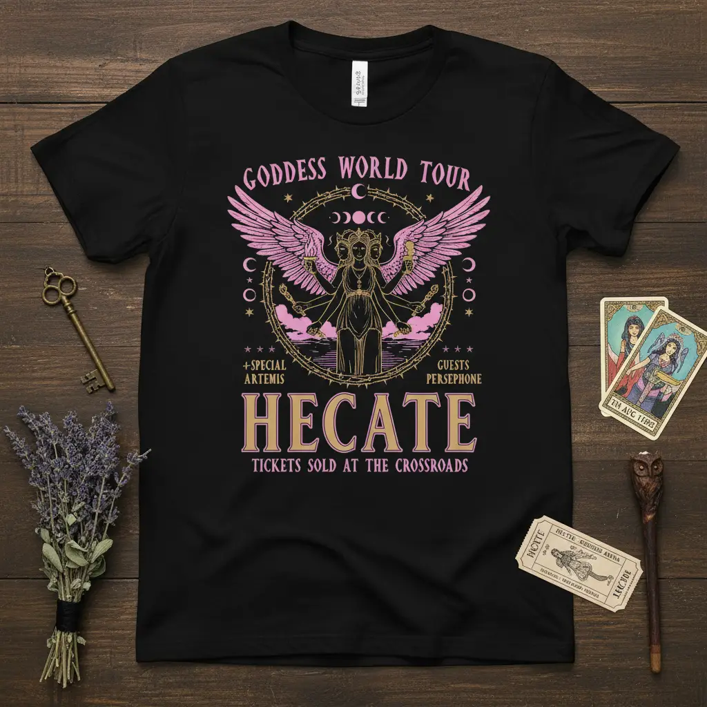 The phrase “Goddess World Tour” reimagines divine figures as rock stars, with “+Special Artemis” and “Guests Persephone” adding layers of mythological depth. This creative concept makes the shirt particularly appealing to those who appreciate a blend of the sacred and the theatrical. The phrase “Tickets Sold at the Crossroads” is a direct nod to Hecate’s association with intersections and choices, adding a layer of symbolic meaning that enthusiasts will deeply appreciate.
