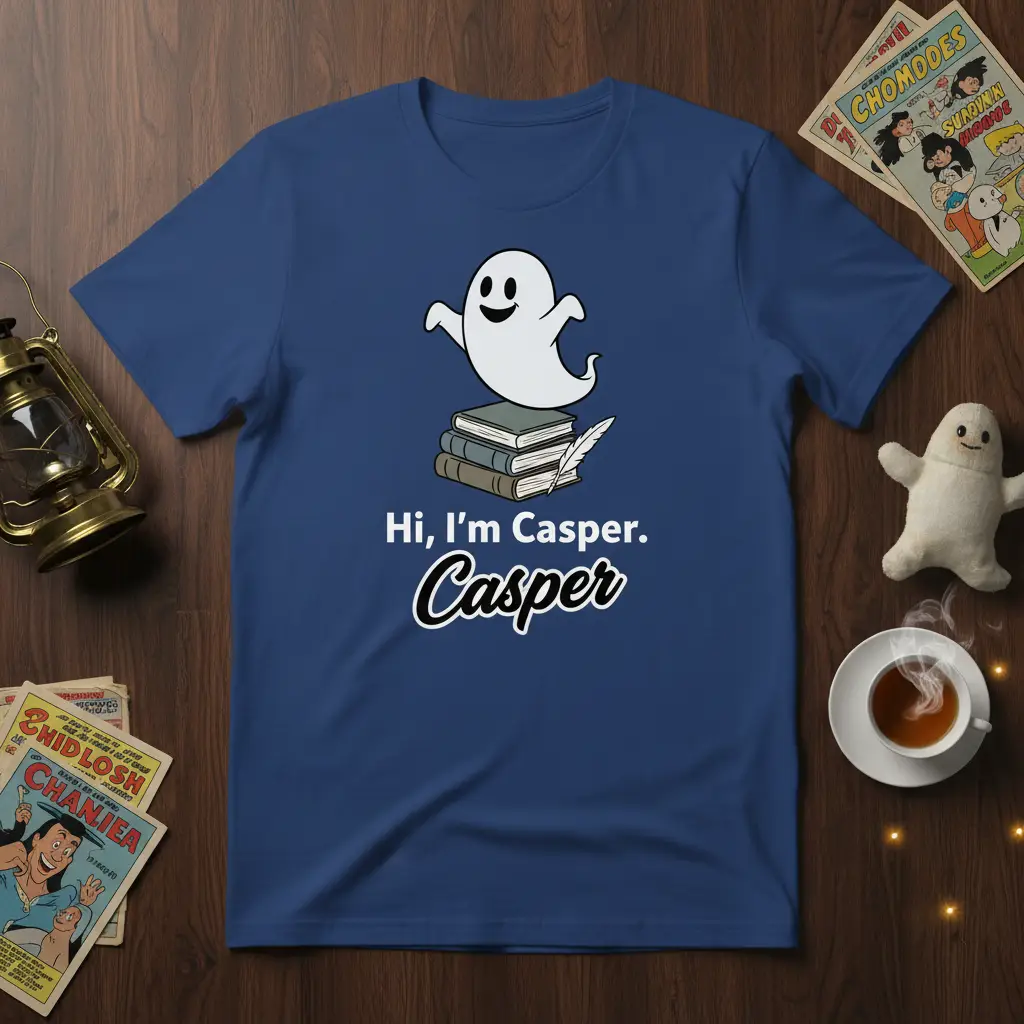 Complementing the excellent fit are our classic color choices, designed to enhance the charm of the “Hi, I’m Casper. Casper.” design. Select from timeless Black, rich Navy, vibrant Red, clean White, subtle Dark Heather, or striking Royal blue. Each color provides a unique backdrop for the friendly ghost and book graphic, allowing you to pick the shade that best suits your personal style and preferences.