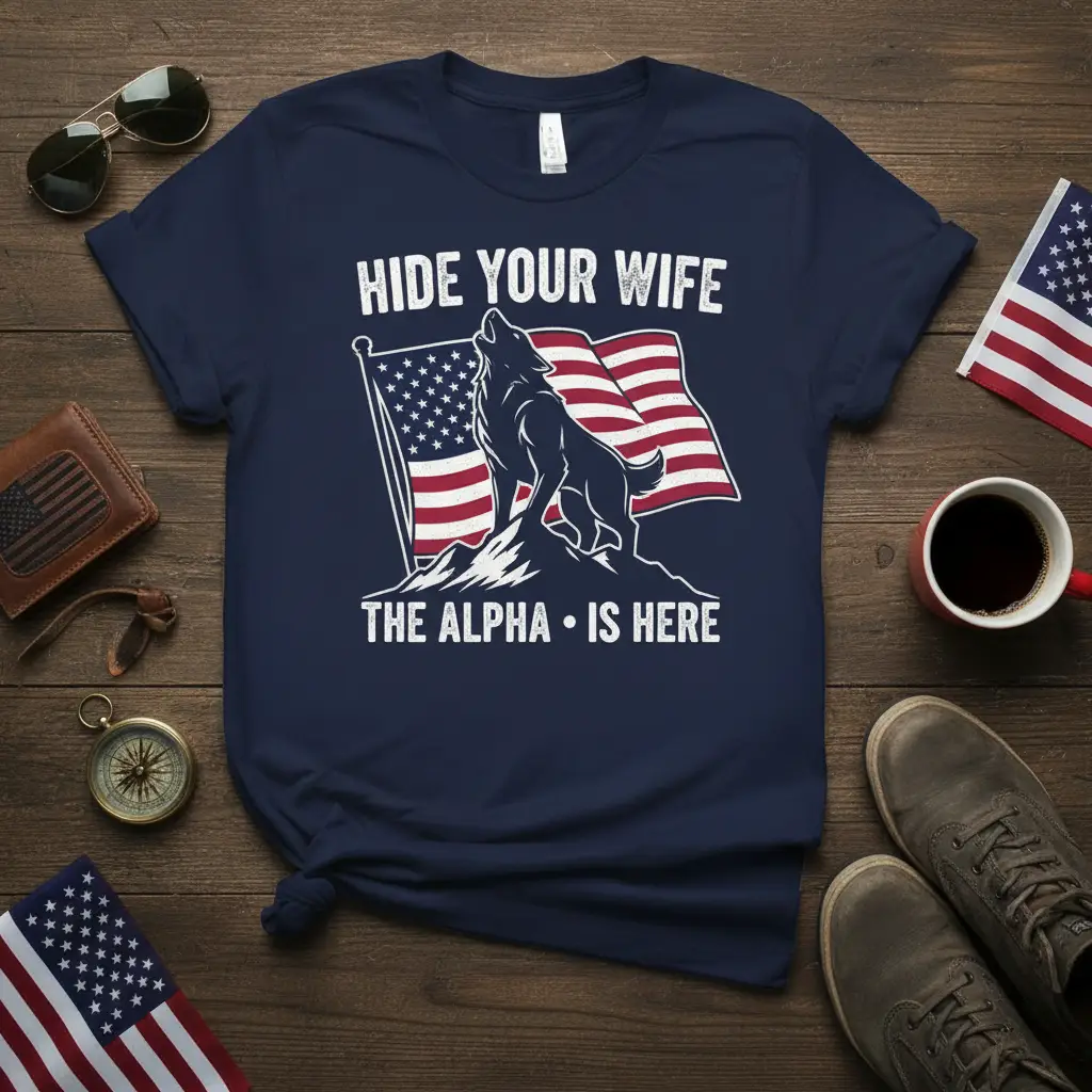 HIDE YOUR WIFE THE ALPHA • IS HERE – Hide Your Wife The Alpha Is Here T-Shirt is designed for the man who commands attention and embodies leadership. This striking graphic tee merges bold typography with a powerful visual, creating a statement piece that speaks volumes. It’s more than just apparel; it’s an assertion of presence and confidence, perfect for those who understand the significance of their arrival. Whether you’re making an entrance or simply expressing your dominant persona, this shirt is your ultimate declaration. Wear it with pride and let the world know who’s in charge.