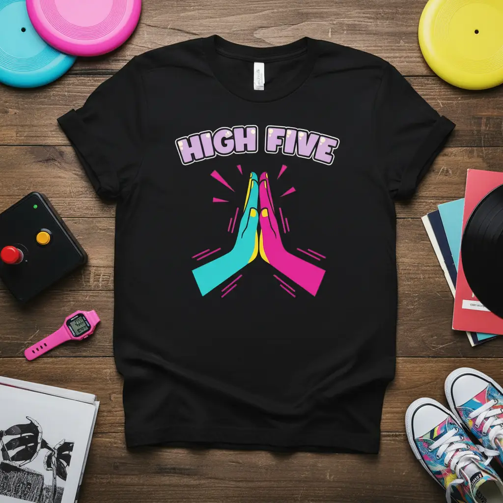 HIGH FIVE! This t-shirt is more than just apparel; it’s a statement of camaraderie, celebration, and pure, unadulterated fun. Whether you’re commemorating a major win, acknowledging a small victory, or simply spreading good vibes, this design captures the energetic spirit of connection. Its vibrant, retro-inspired aesthetic brings a pop of color and nostalgia, making it a stand-out piece for any casual wardrobe. Perfect for gifting to friends, teammates, or anyone who appreciates a positive affirmation, this tee is designed to bring smiles and high fives wherever you go.