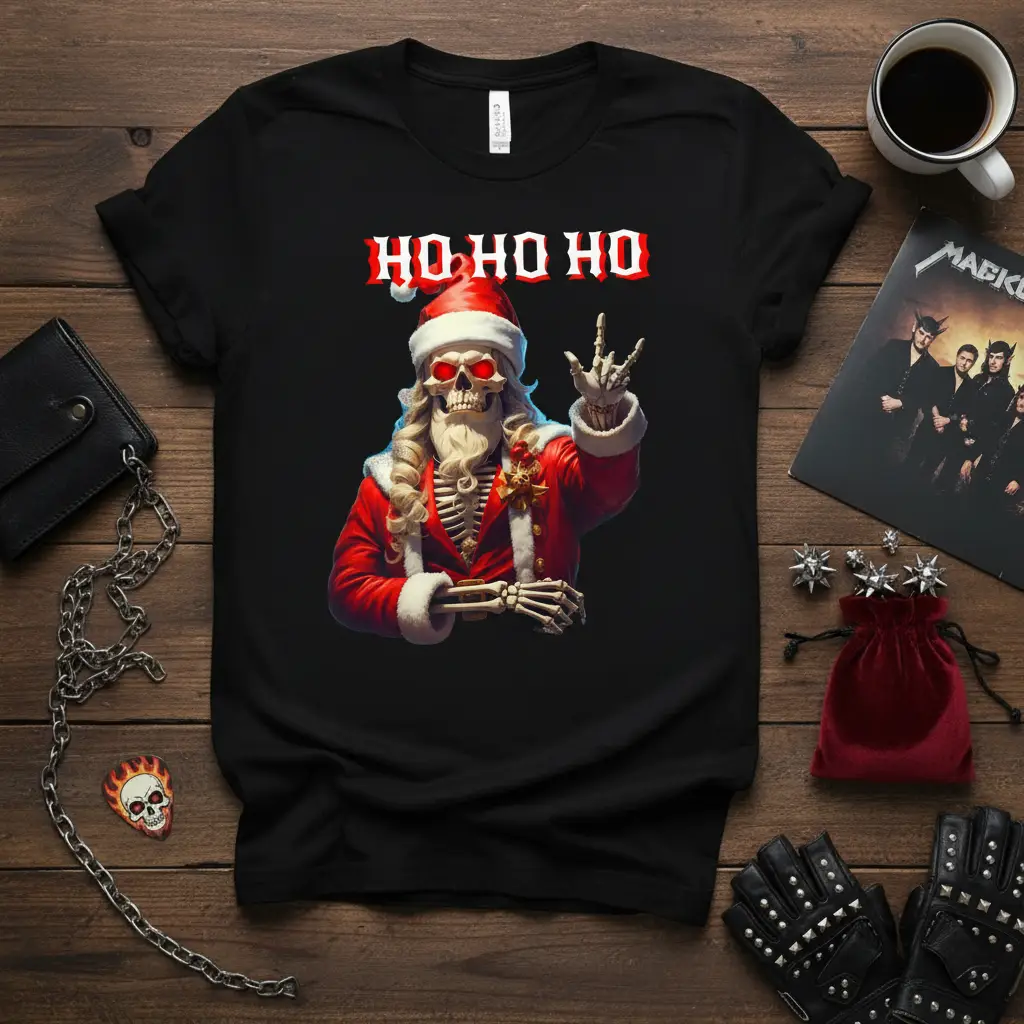 This HO HO HO t-shirt showcases a skeleton Santa Claus ready to rock the holidays. The design combines classic Christmas imagery with a bold, punk-inspired aesthetic. It’s perfect for anyone who wants to stand out from the traditional holiday crowd and express their unique style. The graphic is detailed and vibrant, making it a true statement piece for your festive wardrobe.